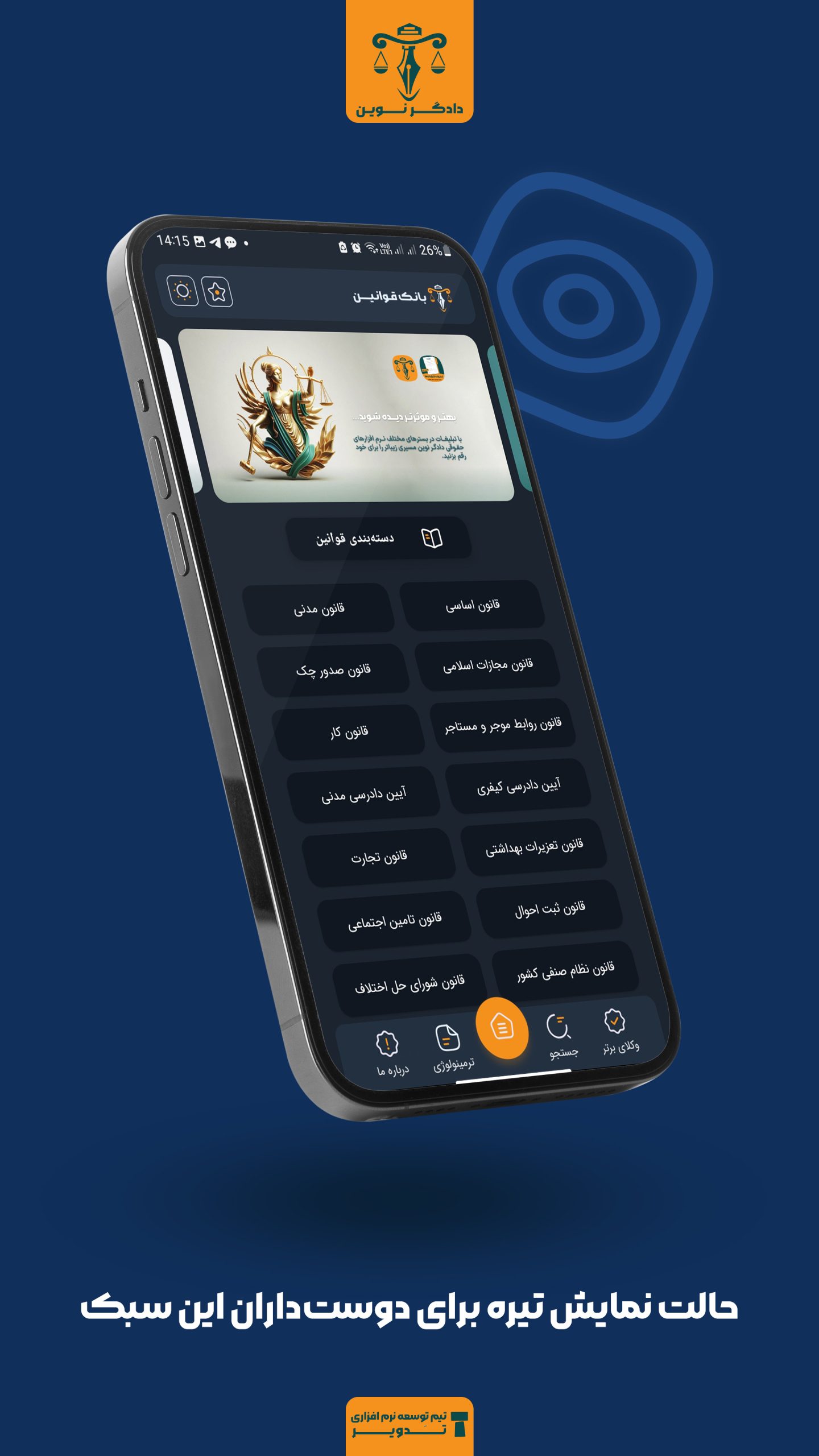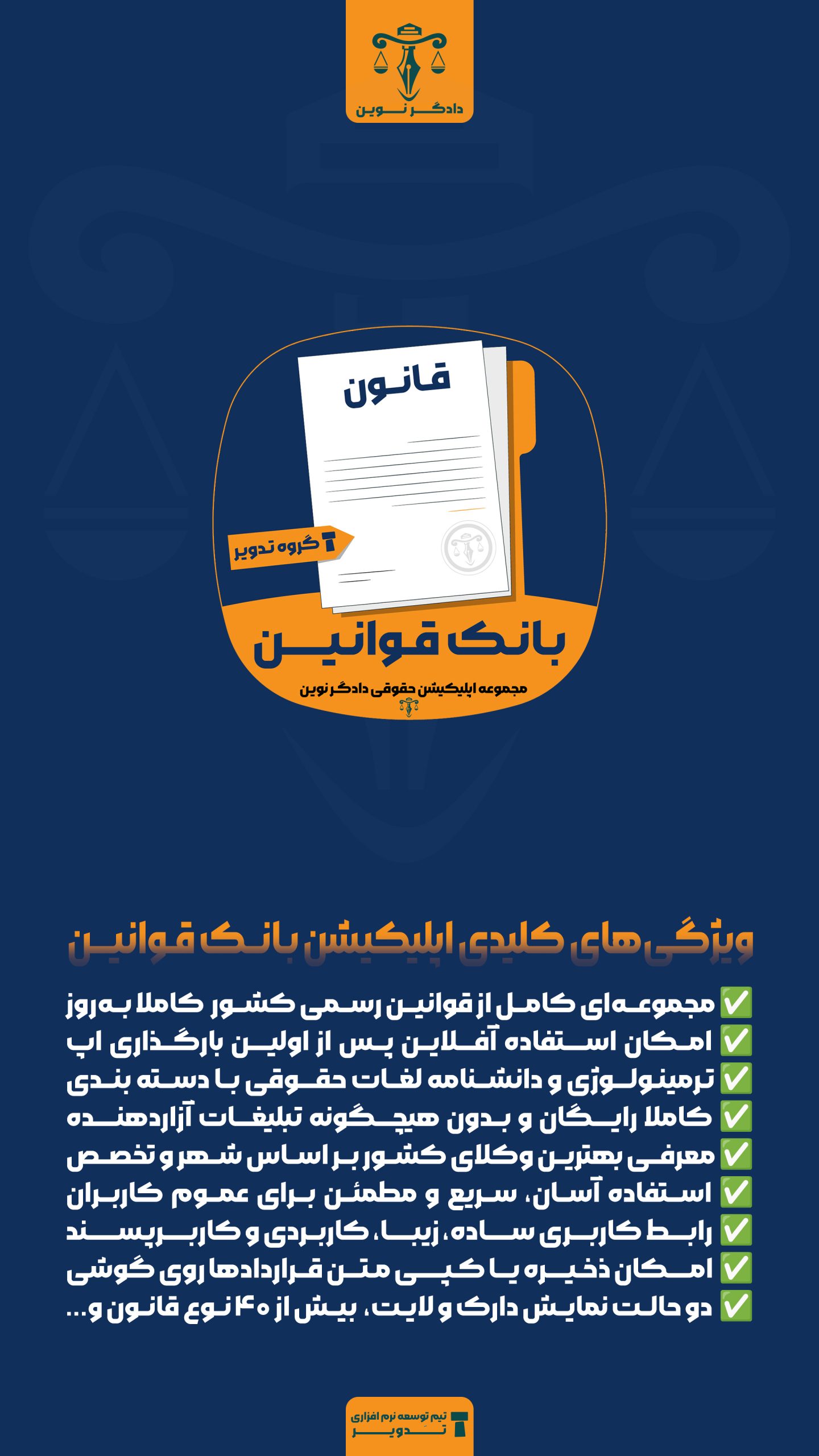 اپلیکیشن « بانک قوانین » در راستای یکی از مجموعه اپلیکیشنهای حقوقی دادگر نوین بوده که هم اکنون به صورت کاملا رایگان در اختیار شما قرار گرفته است تا بتوانید مجموعه کاملی از قوانین را به آسانی همراه خود داشته باشید و بهره ببرید.